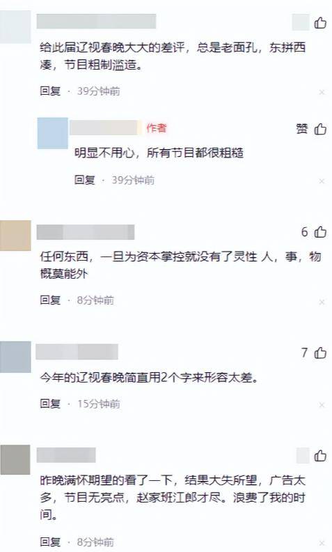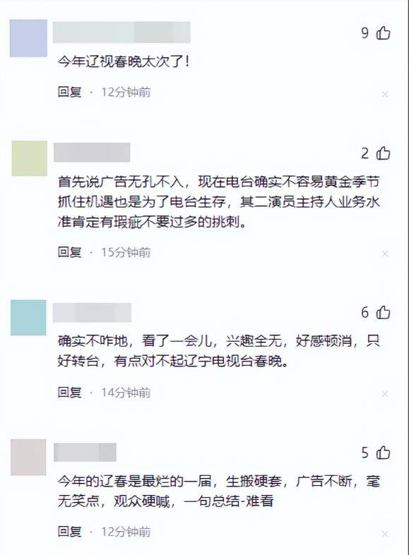 种种负面buff叠加,最后给出的结果就是高开低走,内容被广告切割,不仅流失了观众,还损害了辽宁春晚的名声。