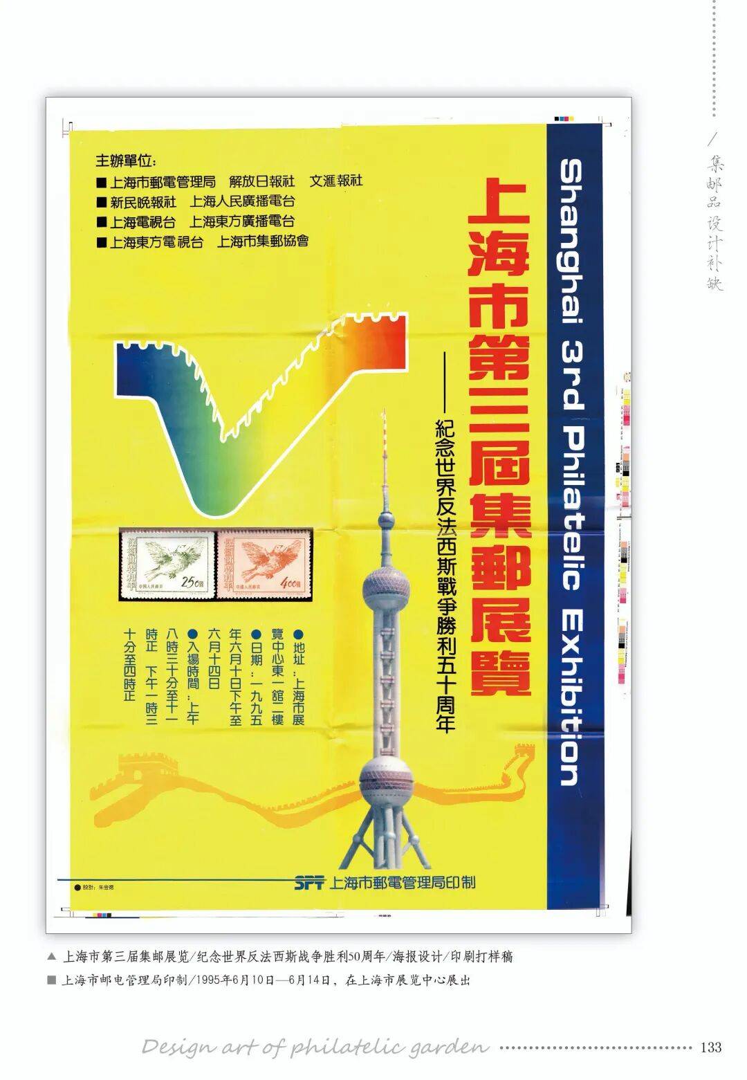 在1995年,为纪念世界反法西斯战争胜利50周年。上海市邮电管理局与解放日报、文汇报、新民晚报、上海人民广播电台、上海东方电视台、上海市集邮协会联袂举办“上海市第三届集邮展览〞,由朱金德设计的邮展海报大家记忆深刻,而此海报印刷打样稿和相关设计报道,及报纸宣传广告设计原样,也在续篇中与广大读者见面。