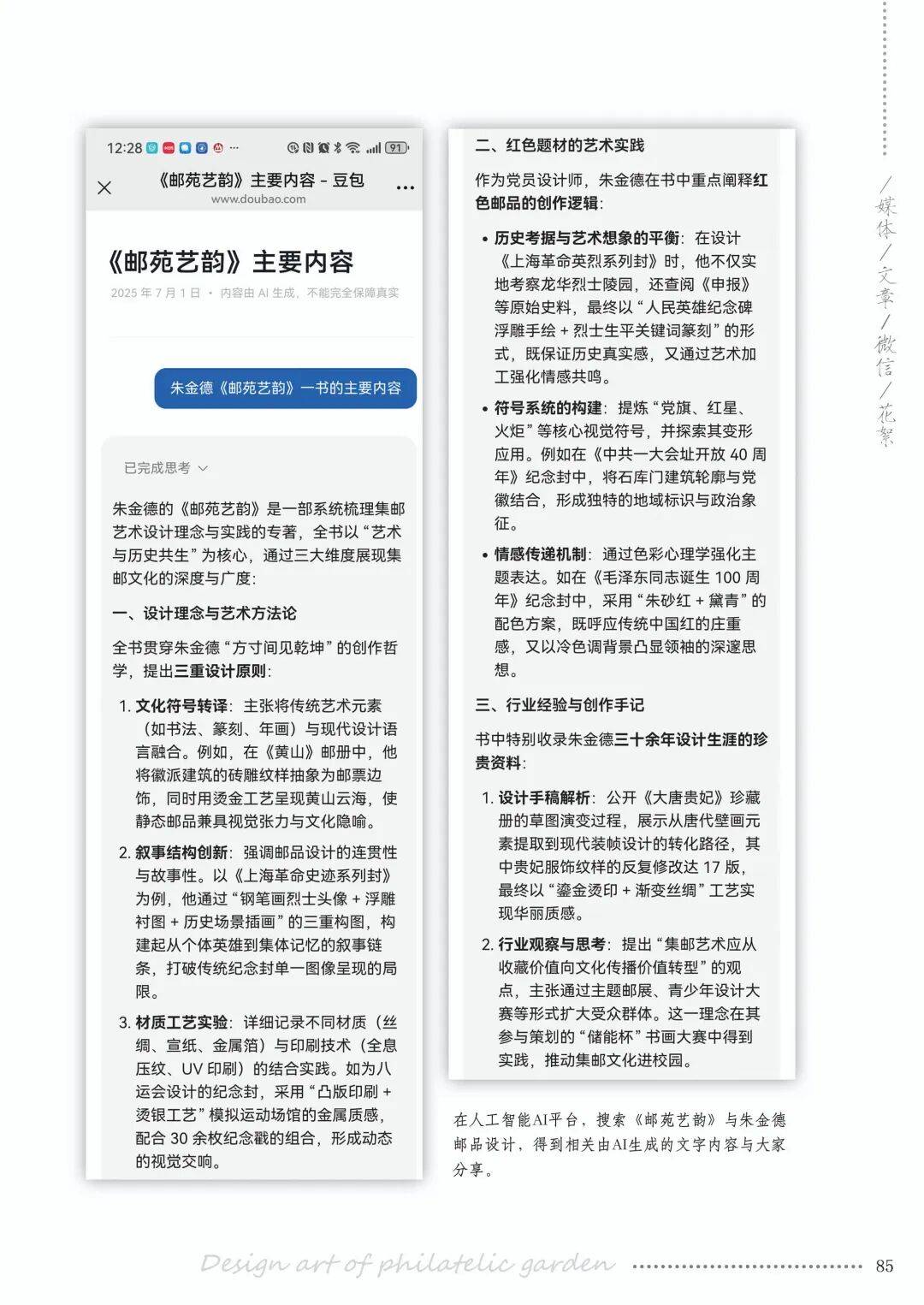 本续篇中,还以数页记录分享了,由人工智能AI平台,搜索《邮苑艺韵》而生成文字内容的介绍,这也说明朱金德《邮苑艺韵》在当前AI来临时代,被社会多媒体的广泛传播与认可。