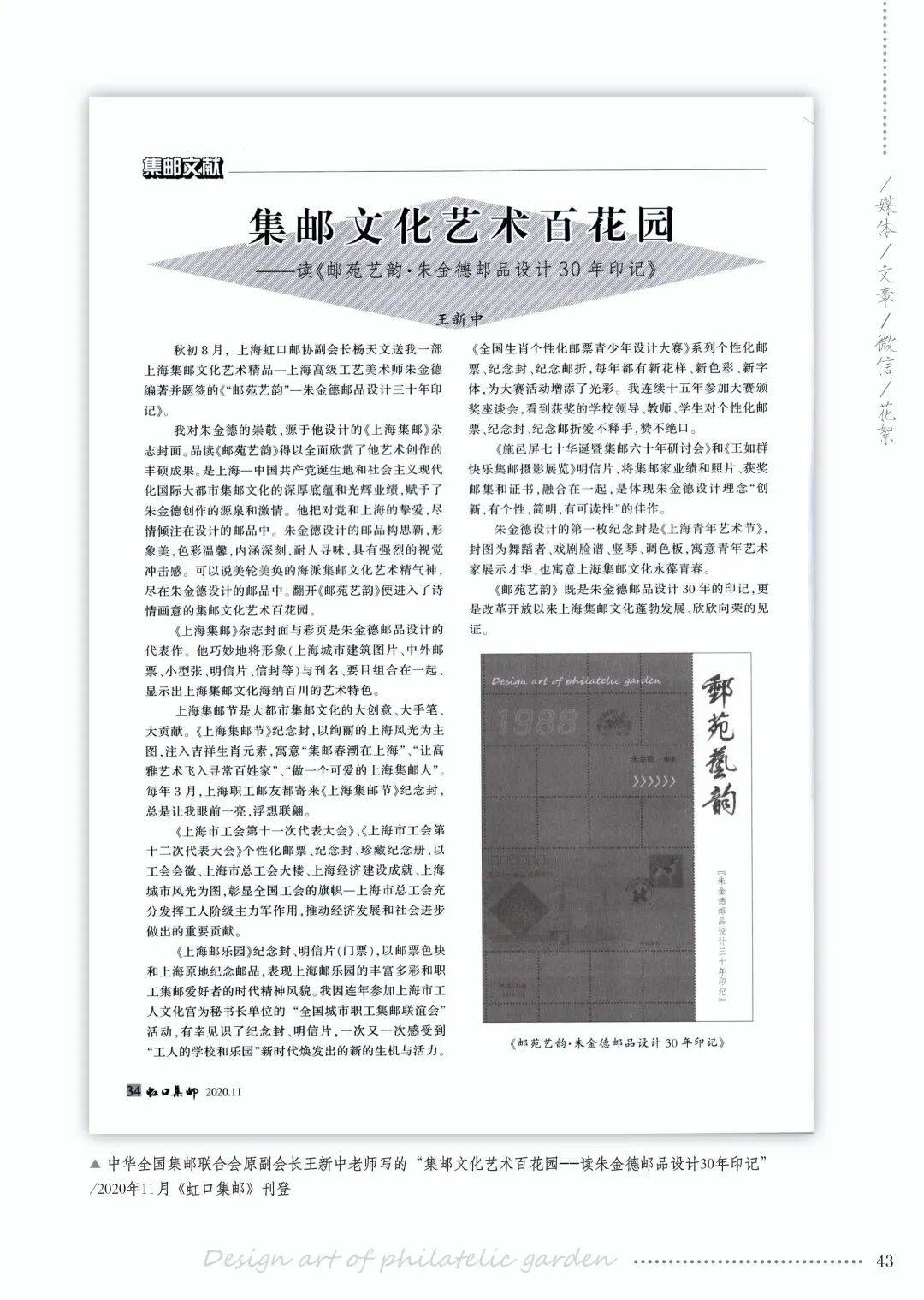 中华全国集邮联合会原副会长、中华全国集邮联合会会士王新中先生认为,朱金德的设计构思新颖,形象俊美,美轮美奂,内涵深刻,耐人寻味,具有强烈视觉冲击力。品读《邮苑艺韵》,得以全面欣赏他的艺术功力,海派集邮文化的精气神,在他的设计中体现得淋漓尽致。